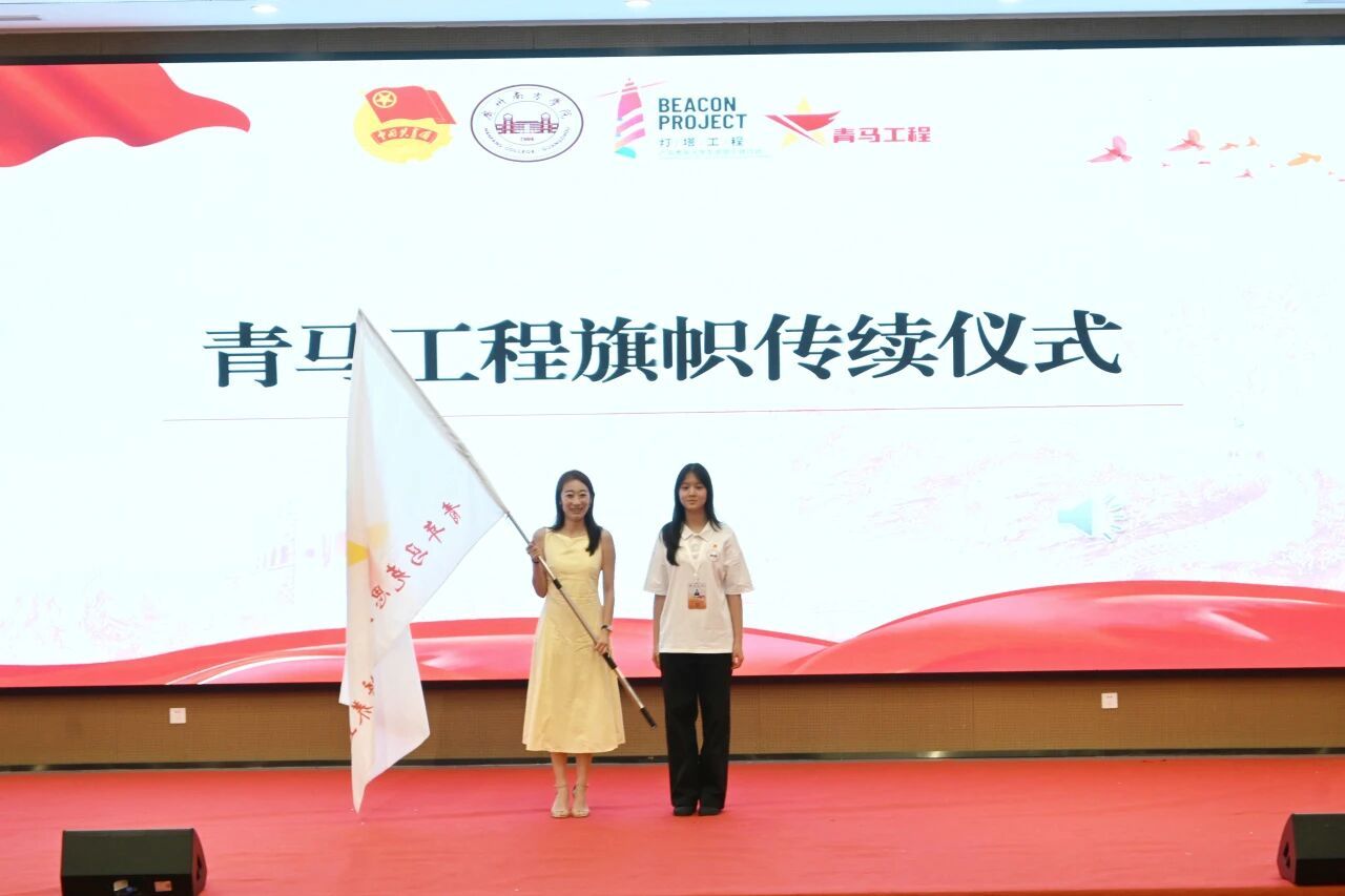 在青马工程旗帜传续仪式上,陈瑞琰同学代表本届青马学员传续青马旗帜。孙蕾婷老师上台接旗。后续,这面旗帜将继续传接到新一期“青马工程”培训班学员手中,让这面象征着责任与担当的旗帜继续飘扬,焕发新的生机。