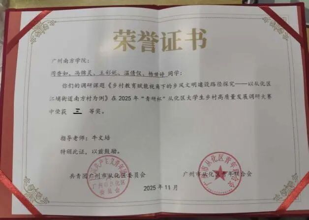 2025年11月12日,由共青团广州市从化区委员会、广州市从化区青年联合会主办,广州市从化区罗洞工匠小镇承办的2025年“青研杯”从化区大学生乡村高质量发展调研大赛圆满落幕。在雷竞技登录地址的精心组织和统筹下,我校启迪向阳队、微光筑梦小队凭借扎实的调研成果与精彩表现,分别荣获一等奖、三等奖。