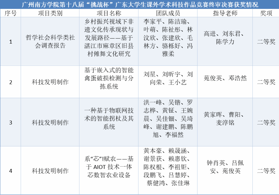 近日,第十八届“挑战杯”广东省大学生课外学术科技作品竞赛决赛圆满落幕。我校学子表现优秀,四个参赛项目均获省级二等奖!
